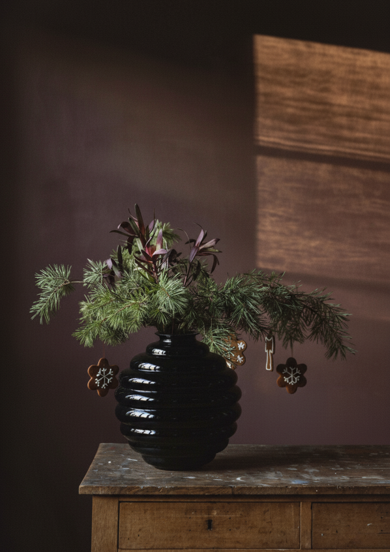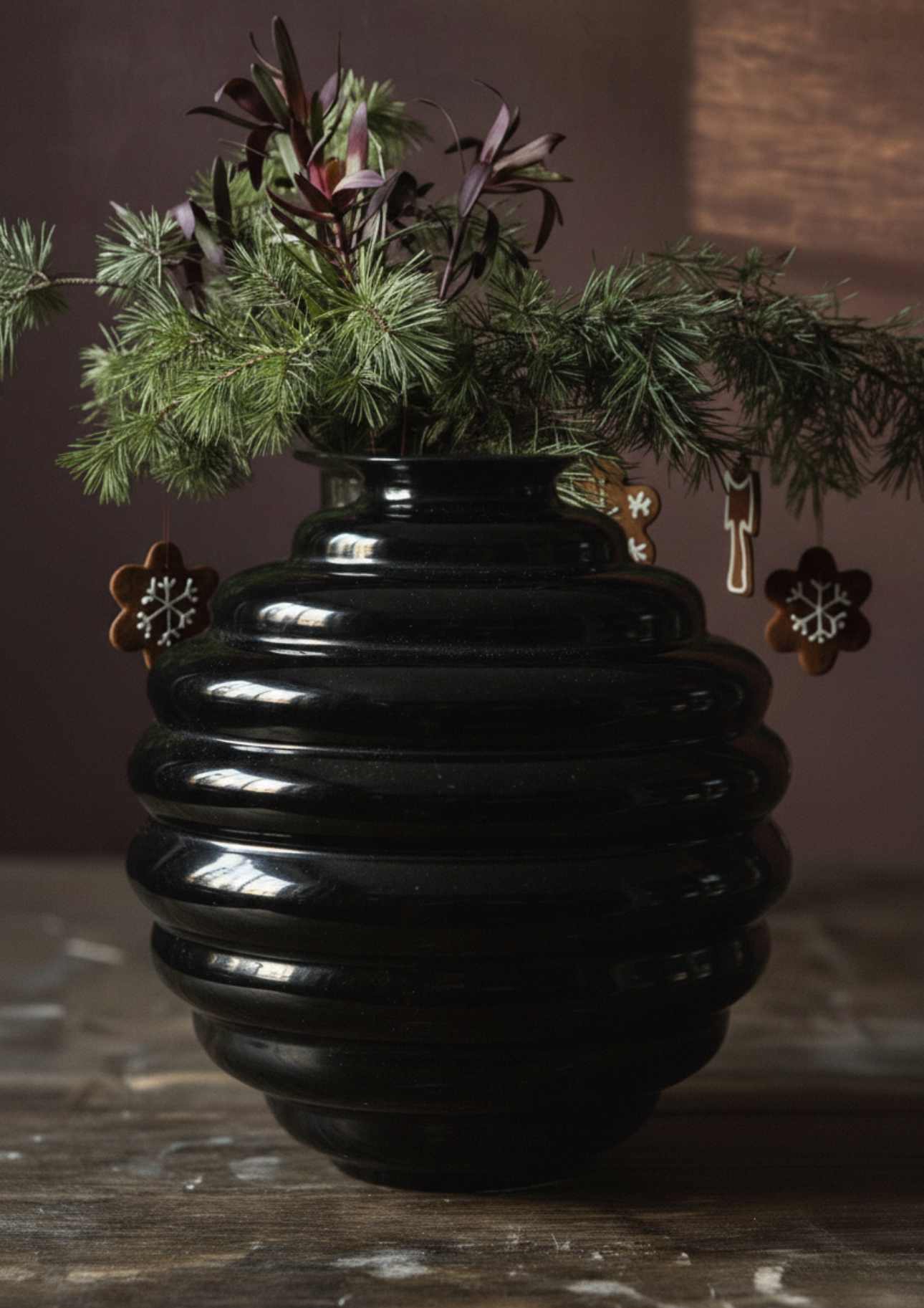 Hand-blown in glossy black opalino glass, the vase is distinguished by its rhythmic, concentric rings that echo the elegance of the Art Deco era. The sculptural silhouette plays with light and shadow, giving the piece a sense of movement and architectural balance.