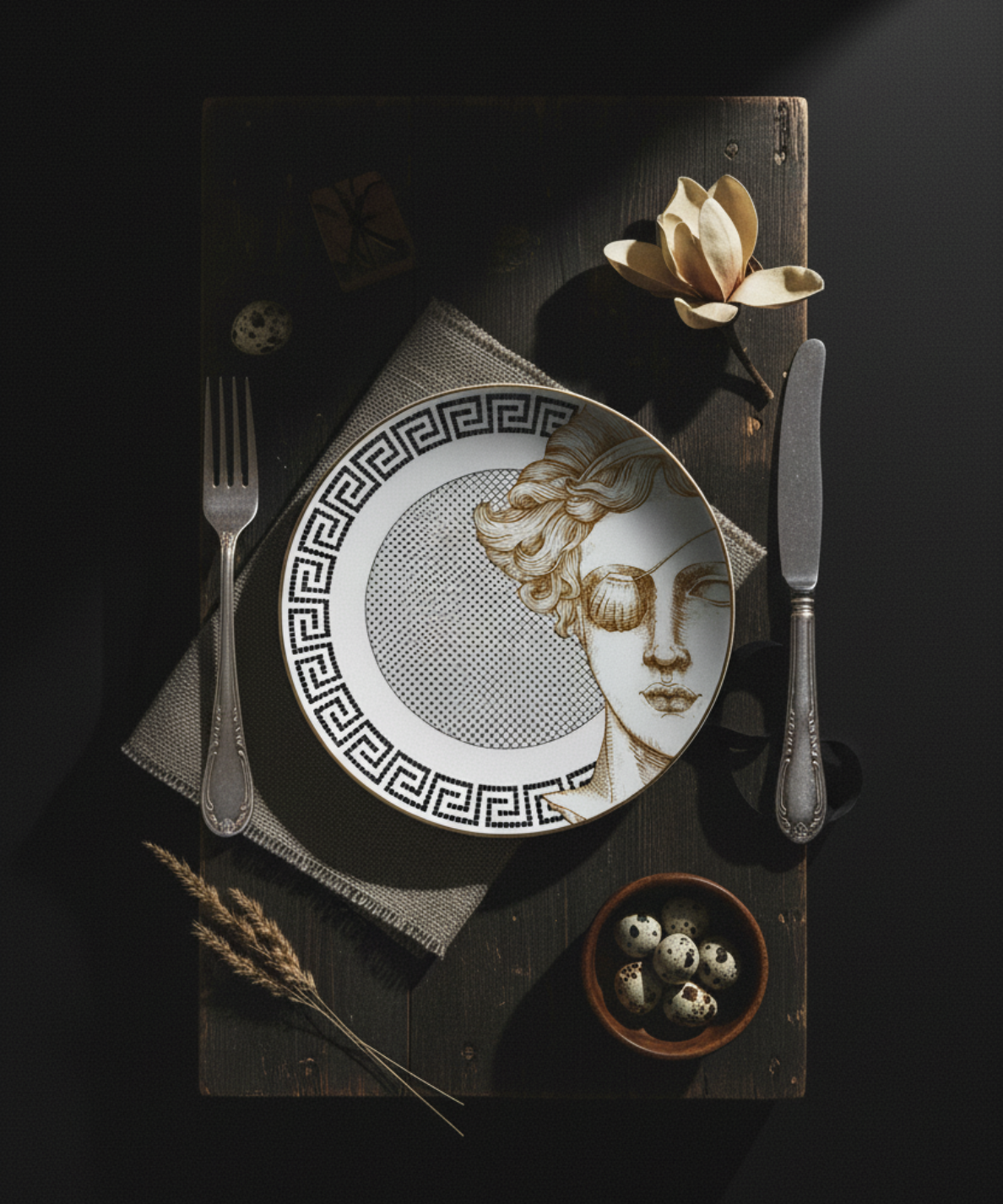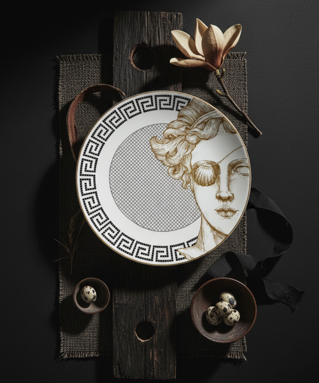 This porcelain plate is a stunning piece of dinnerware that will add a touch of elegance to any table setting. The plate features an illustration of a statue of a lady with an eye patch, inspired by the mythical city of Atlantis. The plate is adorned with a golden detail around the rim, adding a touch of glamour to the design. Whether you’re hosting a formal dinner party or simply looking to upgrade your everyday dining experience, this porcelain plate is sure to impress.