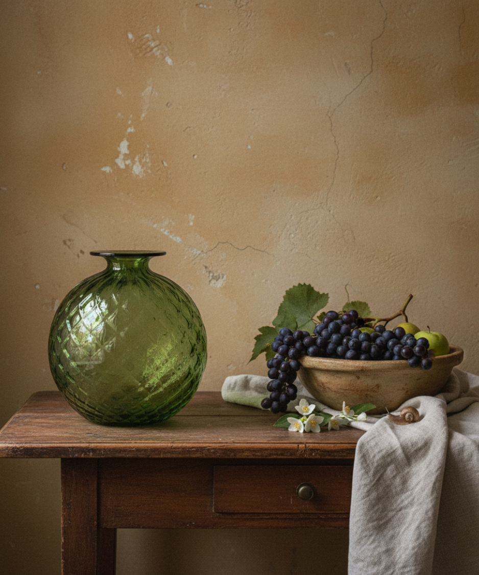 Designed in 1970 by Paolo Venini, the Monofiori Balloton Vase exemplifies the finest Murano glass craftsmanship. Its distinctive quilted texture is created through the traditional balloton technique, where molten glass is hand-blown into a metal mold with a crossed relief, giving the surface a soft, sculptural feel.