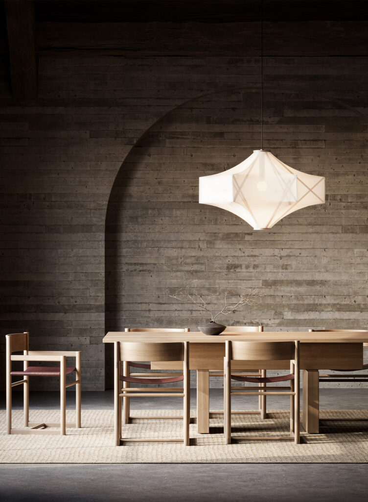 Crafted from recycled and recyclable materials, the Sorpresa’s shade is made of a mesh fabric that gently diffuses light, revealing the geometric outlines of its expertly assembled oak frame. With a width of one meter, the Sorpresa makes an impressive choice for lighting above a dining table or in a living space – particularly in more spacious rooms where it can be surrounded by ample open space.